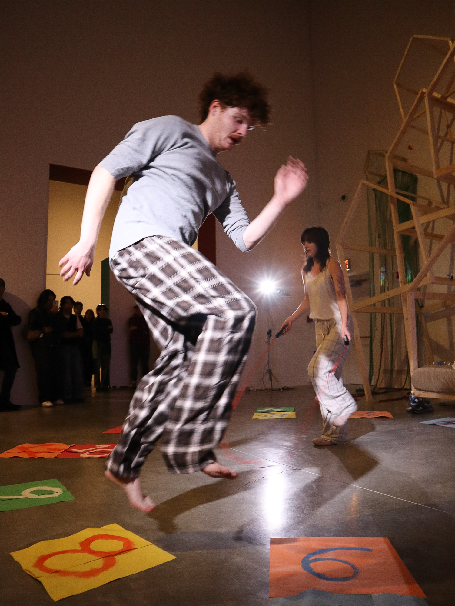“What do you know about portals? Scientists Cole Johnson and Sasha Terway have spent the latter half of four years researching this very topic and have found a weak point in spacetime that has been widely overlooked in the field: dreams. When the brain enters its dream REM cycle, the fabric of reality weakens just enough to create the right conditions for time travel. Cole and Sasha have discovered, with the right equipment, that one can puncture a hole through the fabric of reality and jump a small distance into the future. And what is this equipment, you ask? A jump rope, but not just any jump rope, a prototype that can tap into the dreamer’s cosmic imagisphere, controlling time itself, each hop bringing the world another inch into the future, and a circular hopscotch rig to hold the fabric of space in place while time is spinning out of control. However, these theories were just ideas of dreamers, not applied to the real world of science. So on November 7th at 5:45pm Cole and Sasha sought to put their rhythmic motions of jumprope and hopscotch to the test accompanied by their test subjects rem cycle (Bazooka) they would jump and hop for 15 minutes straight (any longer could do irreparable damage to the space time continuum without proper testing), to jump forwards in time 2 months 24 days and 7 hours to the new year 2026.”